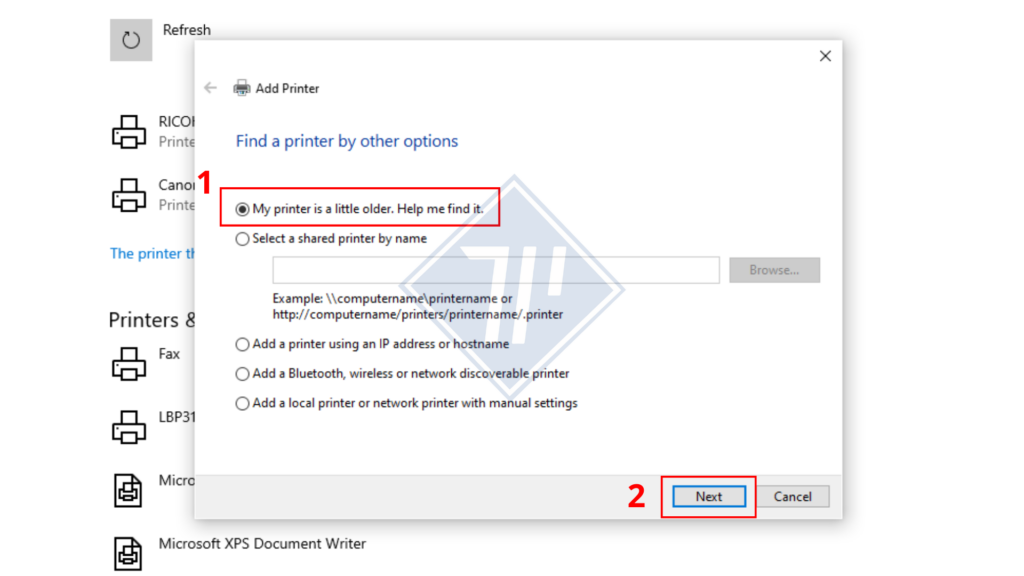 - Bước 5: Trong bảng tiếp theo được hiển thị, chọn My printer is a little older. Help me find it. > Next. Chờ một lúc để hệ thống tiến hành tìm kiếm máy in của bạn. Sau đó, chỉ cần bấm Next và chọn kết nối là bạn đã hoàn thành quy trình liên kết máy in với máy tính, laptop.