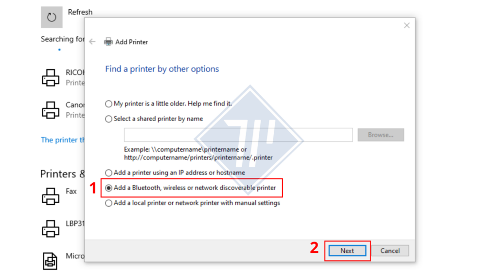 - Bước 6: Trong bảng tiếp theo được hiển thị, chọn Add a Bluetooth, wireless or network discoverable printer > Next. Chờ một lúc để hệ thống tiến hành tìm kiếm máy in của bạn. Sau đó, chỉ cần bấm Next và chọn kết nối là bạn đã hoàn thành quy trình liên kết máy in với máy tính, laptop.