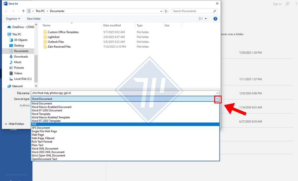 - Bước 3: Tại ô Save as type, nhấp vào mũi tên mở rộng và chọn định dạng file bạn muốn lưu > Nhấp vào Save.