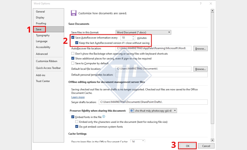- Bước 2: Chờ hộp thoại Word Options hiện ra. Sau đó vào mục Save > Điều chỉnh thời gian lưu thông tin tại mục Save AutoRecover information every … minutes > Bấm chọn Keep the last AutoRecovered version if I close without saving > OK.