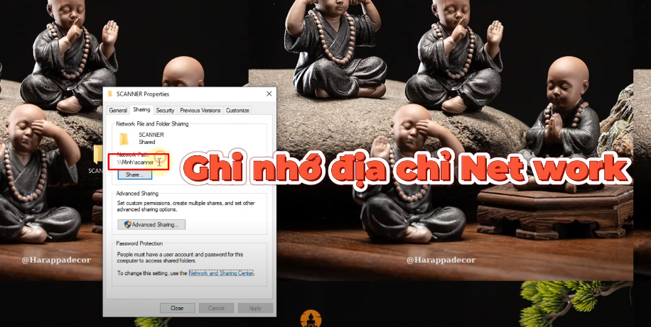- Sau khi trở về hộp thoại SCANNER Properties, hãy ghi nhớ địa chỉ Network Path > Chọn Close để đóng tab Sharing.