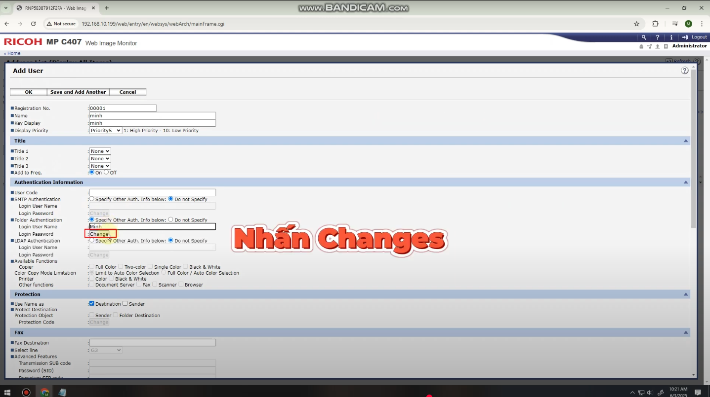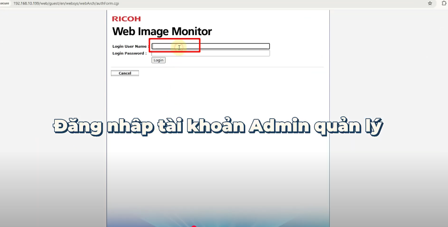 - Mở trình duyệt web và nhập địa chỉ IP của máy Ricoh để truy cập giao diện quản trị > Đăng nhập bằng tài khoản quản trị Admin.