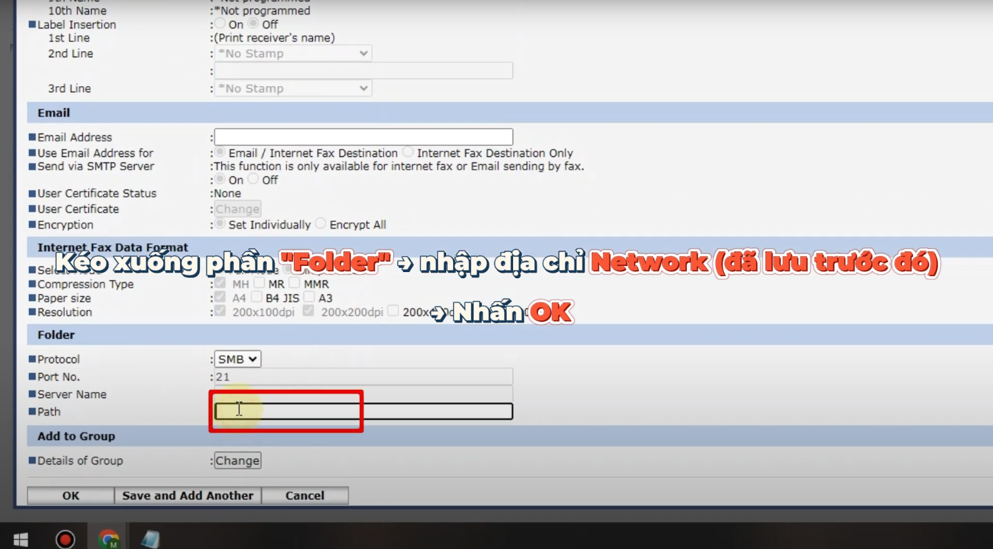 - Kéo xuống mục Folder, chọn giao thức Protocol là SMB và nhập địa chỉ thư mục từ Network Path đã lưu trước đó vào mục Path > OK.