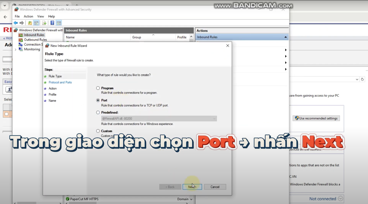 - Trong giao diện New Inbound Rule Wizard vừa hiện ra > Chọn Port > Nhấn Next.