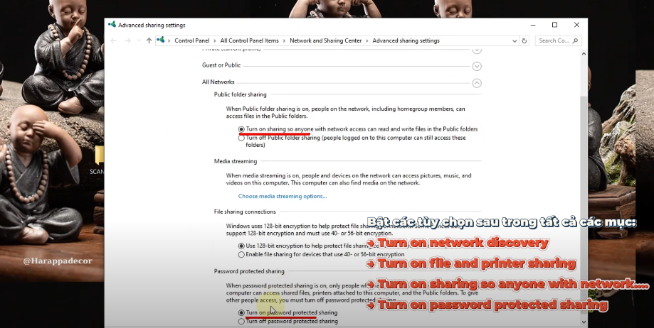 - Trong mục Guest or Public, bật tất cả các tùy chọn Turn on network discovery, Turn on file and printer sharing. Còn trong mục All Networks, bật tùy chọn Turn on sharing so anyone with network… và Turn on password protected sharing.