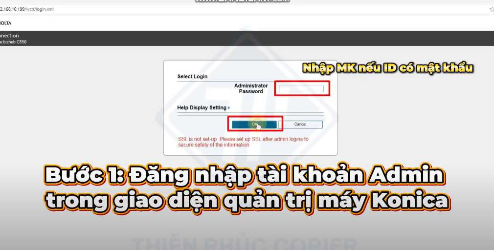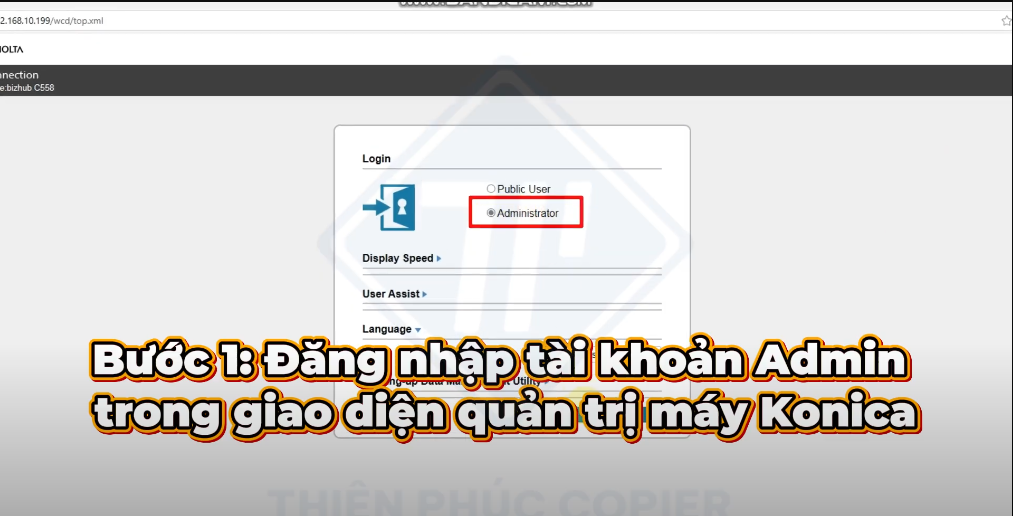 - Truy cập giao diện quản trị máy photocopy Konica > Đăng nhập tài khoản Admin > Tick chọn Administrator.