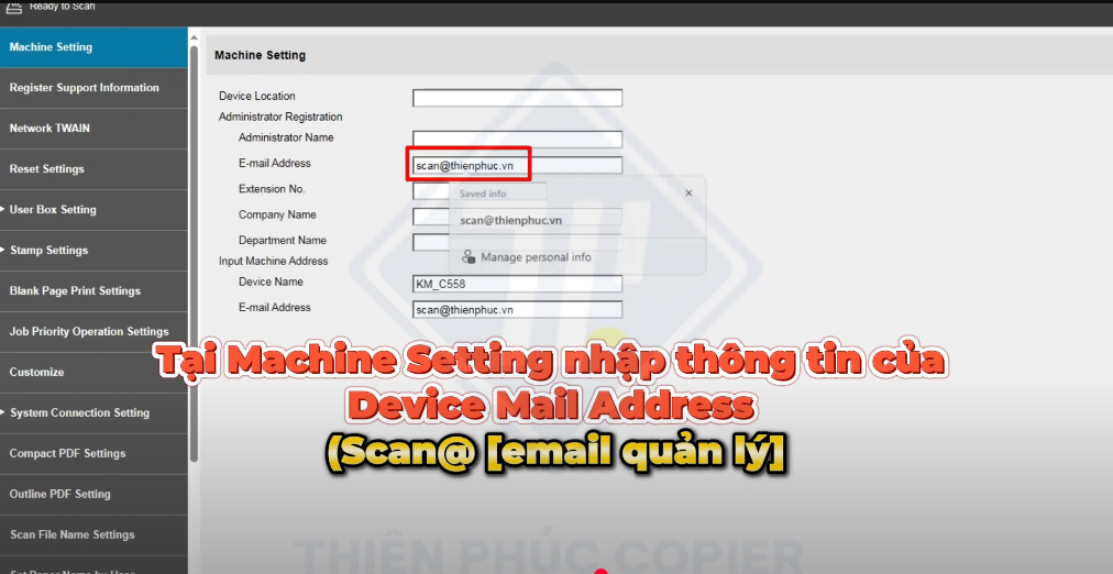 - Tại giao diện Machine Setting, nhập thông tin của Device Mail Address vào ô E-mail Address theo dạng scan@emailquảnlý > Nhấn OK.