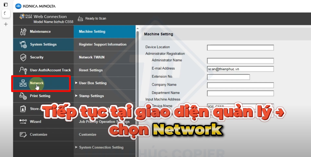 - Quay trở lại giao diện quản trị máy photocopy Konica > Bấm vào mục Network.