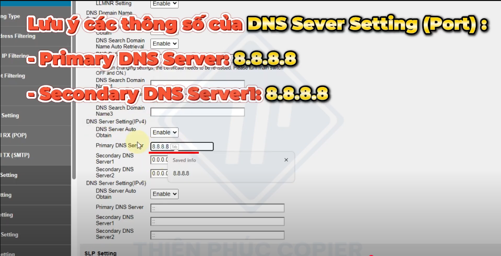 - Tại giao diện TCP/IP Setting, nhập các thông số Primary DNS Server và Secondary DNS Server1 là 8.8.8.8 > Nhấn OK.