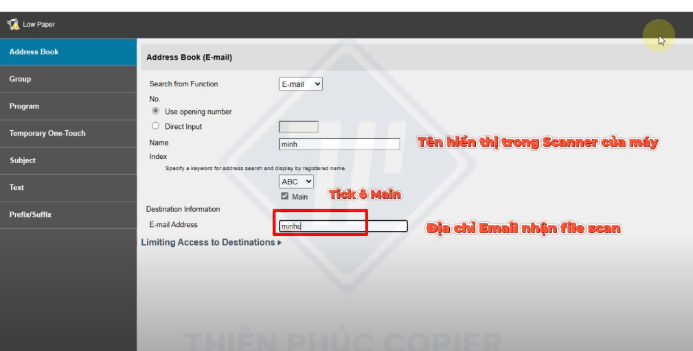 - Tại mục Search from Function > Chọn giao thức E-mail > Nhập tên hiển thị trong Scanner của máy ở mục Name > Tick ô Main > Nhập địa chỉ Email nhận file scan.
