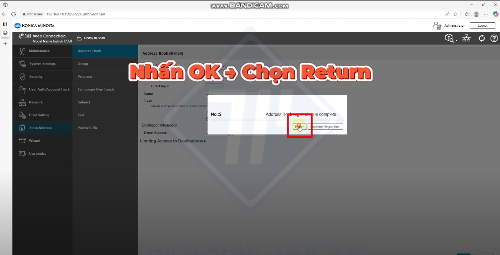 - Nhấn OK > Return. Vậy là bạn đã hoàn thành quá trình thiết lập cài Scan To Email trên máy photocopy Konica.