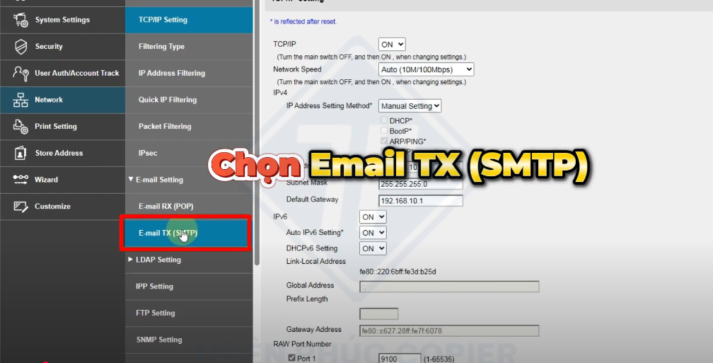 - Bấm vào mục Network ở góc trái màn hình > Chọn E-mail TX (SMTP).