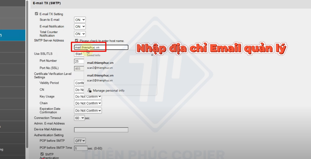 - Tại mục SMTP Server Address, tick vào ô Please check to enter host name > Nhập địa chỉ email quản lý.