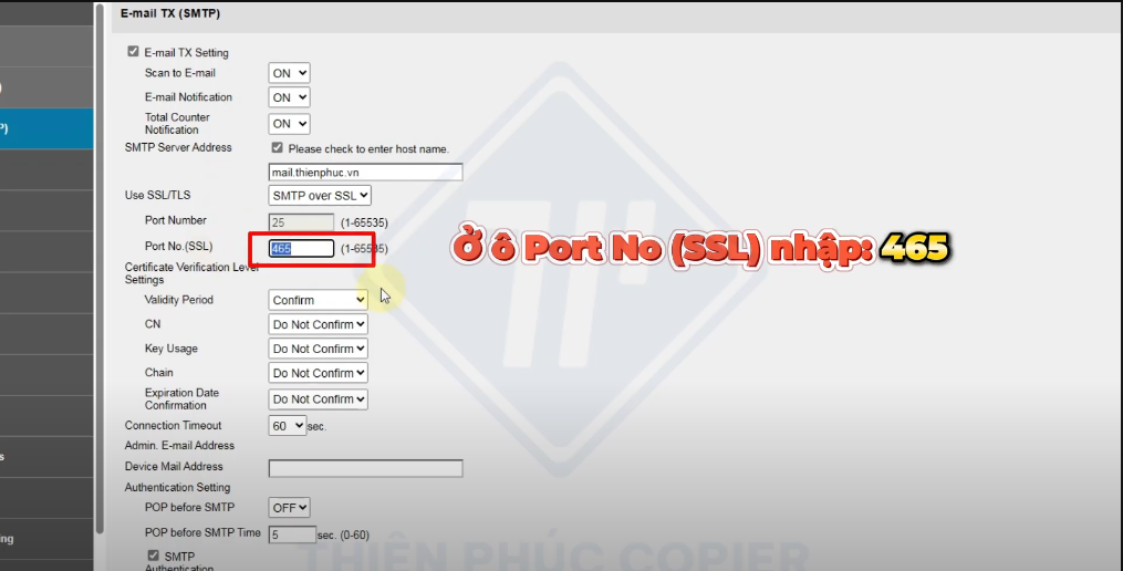 - Tại mục Use SSL/TLS, chọn SMTP over SSL > Nhập 465 vào ô Port No.