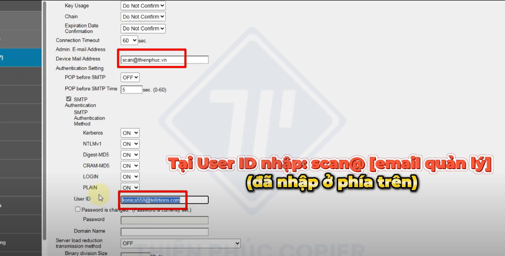 - Tại mục Device Mail Address, nhập scan@emailquảnlý giống ví dụ ảnh dưới đây > Nhập tương tự tại User ID.