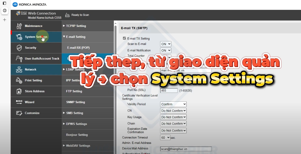 Để cài Scan To Email máy photocopy Konica, bạn cần truy cập giao diện quản trị dành riêng cho thiết bị và thực hiện theo 5 bước sau.