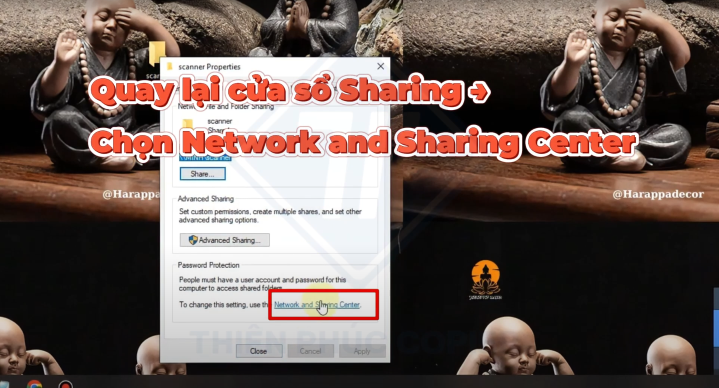 - Khi quay lại cửa sổ scanner Properties, bấm vào Network and Sharing Center.