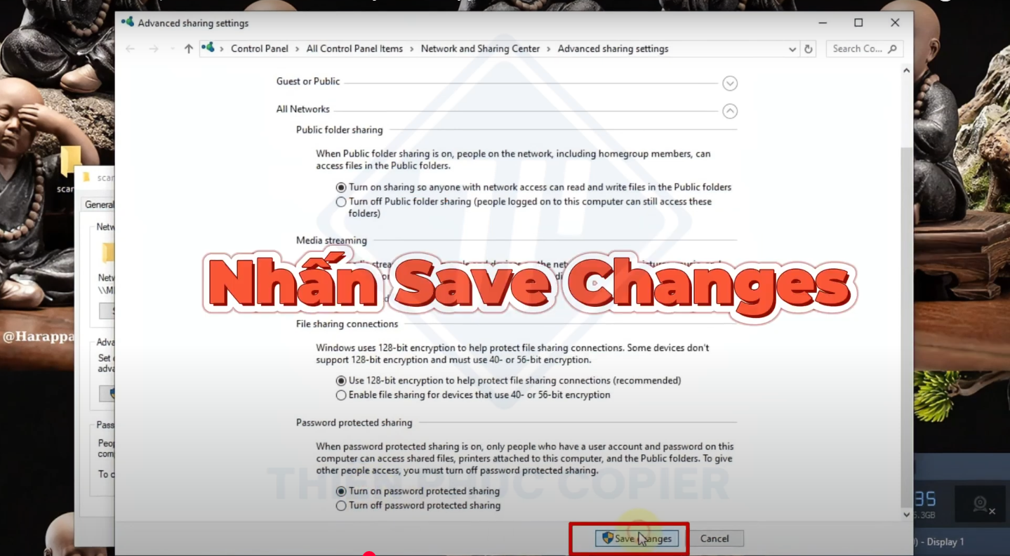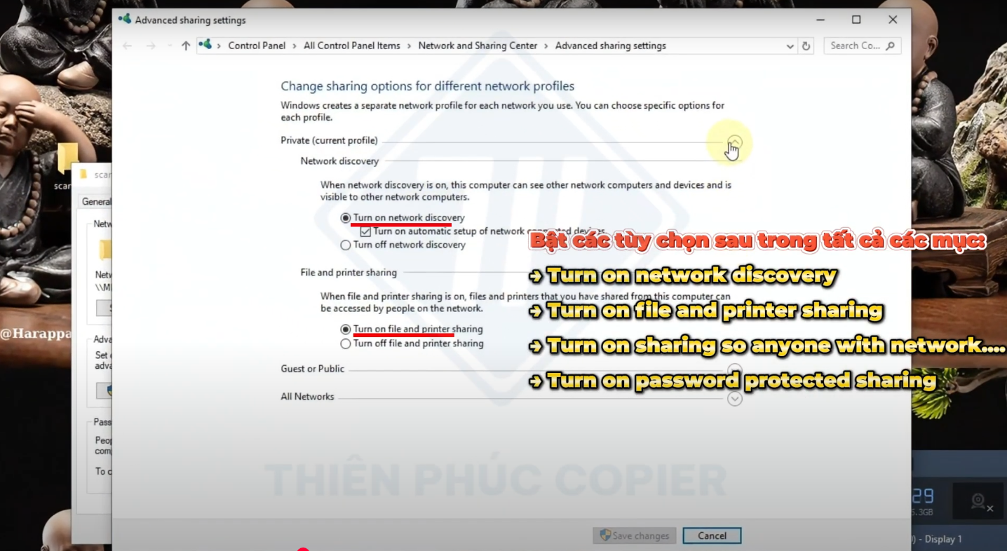 - Click vào tất cả các tùy chọn sau: Turn on network discovery; Turn on file and printer sharing; Turn on sharing so anyone with network access can read and write files in the Public folders; Turn on password protected sharing.