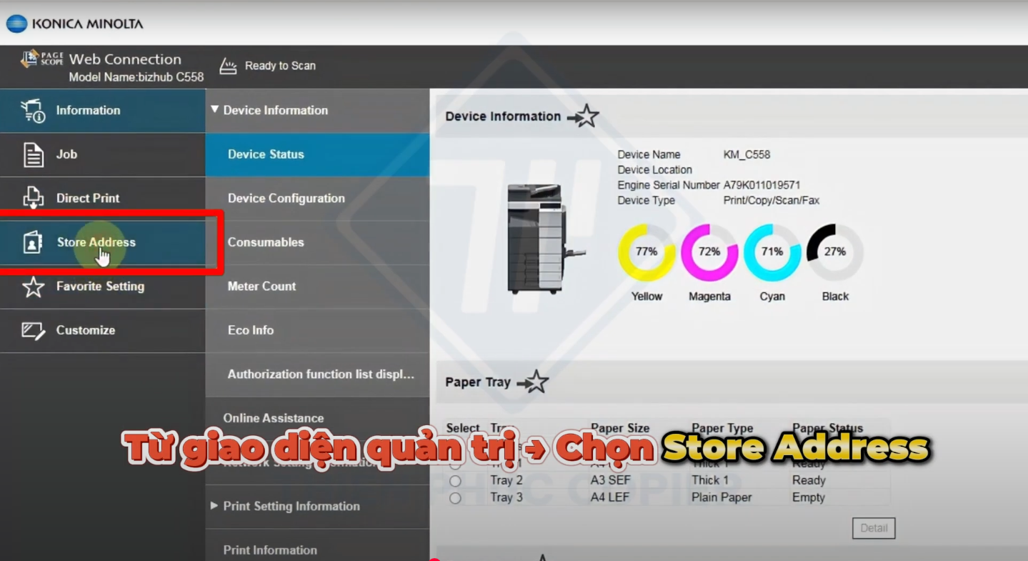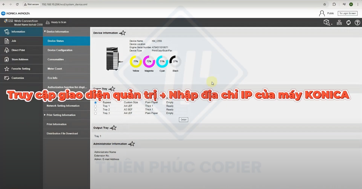 - Truy cập giao diện quản trị thiết bị > Nhập địa chỉ IP của máy photo Konica.