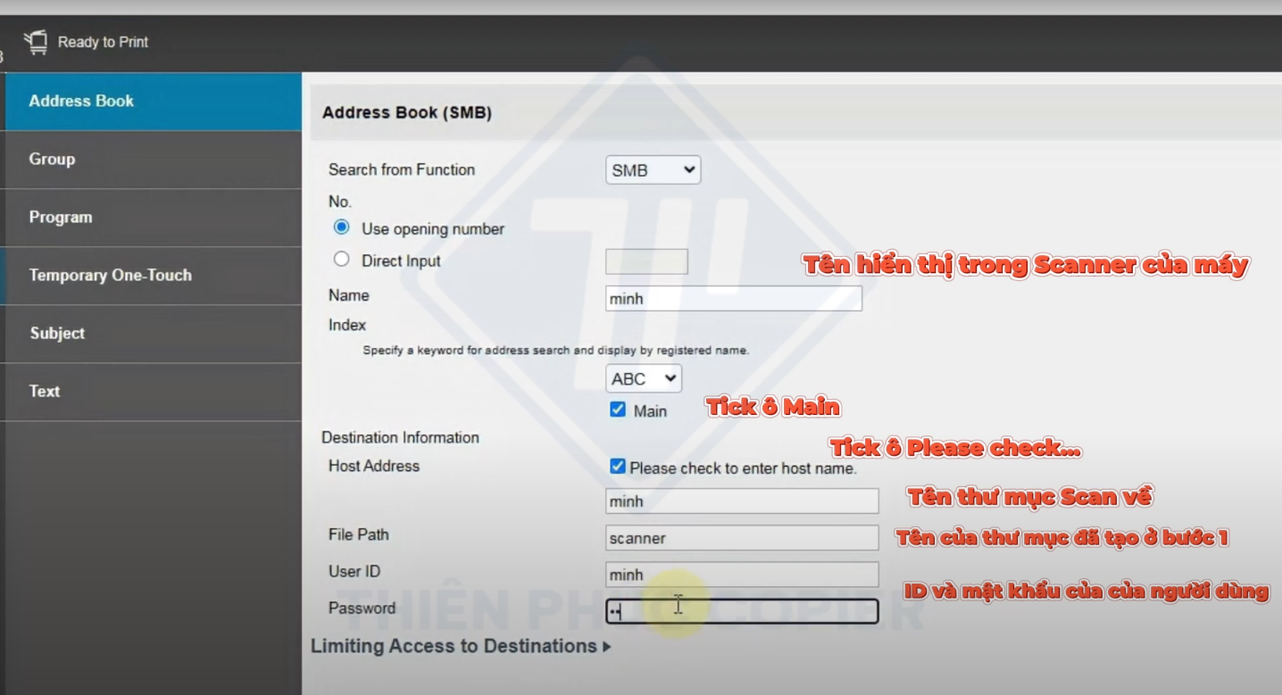 - Tại Search from Function, chọn SMB > Nhập tên hiển thị trong Scanner của máy vào ô Name > Tick ô Main & Please check to enter host name > Tại ô Host Address nhập tên thư mục scan về > Tại File Path nhập tên của thư mục đã tạo ở bước 1 > Điền ID và mật khẩu của người dùng > Nhấn OK > Return.