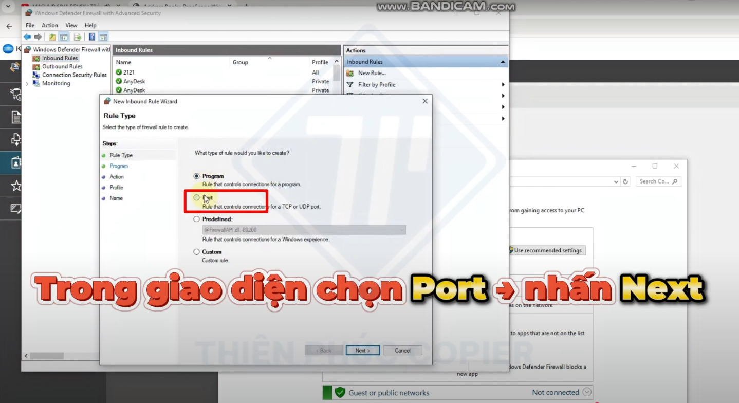 - Trong cửa sổ New Inbound Rule Wizard, tick chọn Port > Next.