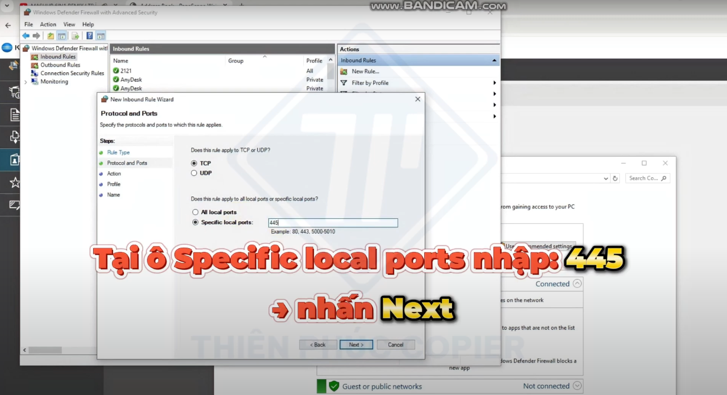 - Tại ô Specific local ports, nhập 445 > Next > Next lần 2.