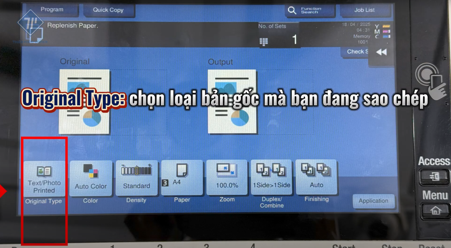 - Original Type: Dùng để chọn loại bản gốc mà bạn copy. Với các phân loại là Text (Văn bản thuần chữ); Text/Photo (Tài liệu có cả chữ và hình ảnh); Photo Printed (Hình ảnh); Photo Paper (Sách, báo, tạp chí); Map (Bản vẽ kỹ thuật, bản đồ).